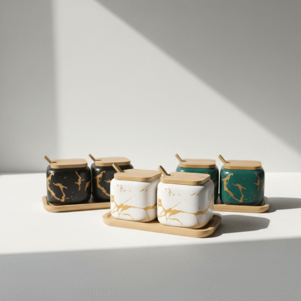 Elevate your kitchen with this premium marble spice jar set. Features stunning black, white, and green finishes, smooth crafted lids, and matching tray—crafted for Lebanese homes.