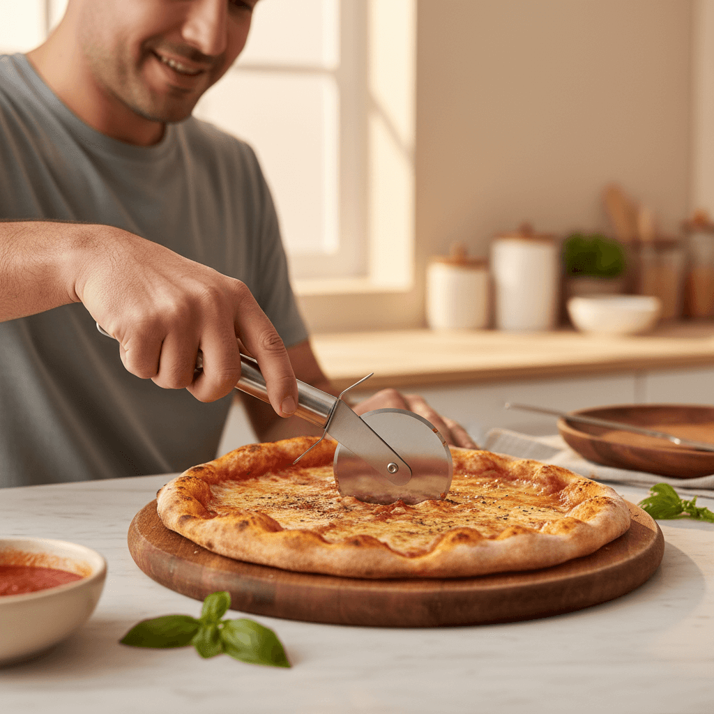 The 19.5 cm pizza cutter is perfect for slicing pizza quickly, serving guests, or preparing kids’ meals. Its ergonomic handle and sharp wheel ensure smooth, straight slices with minimal effort.