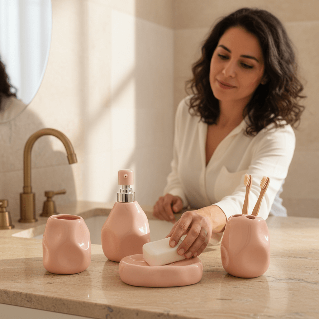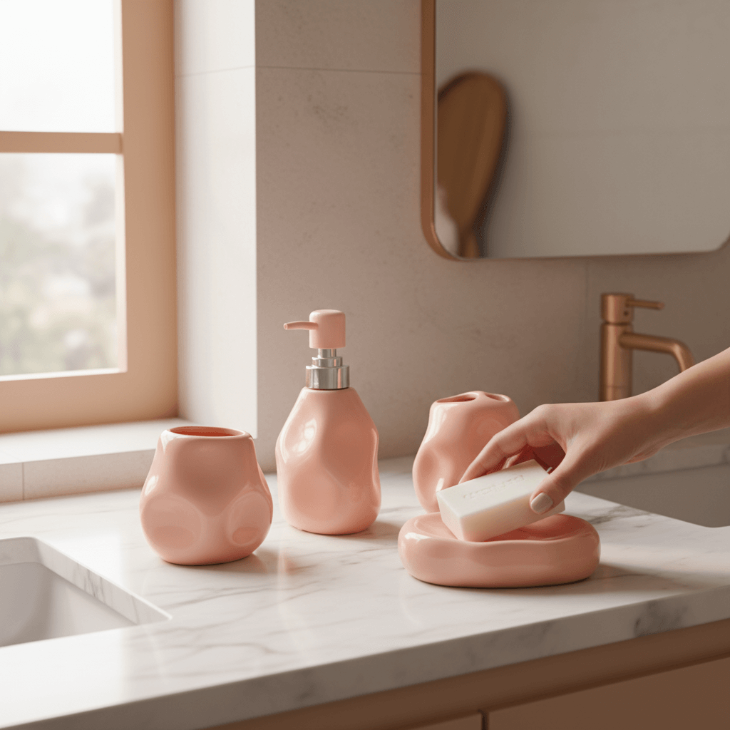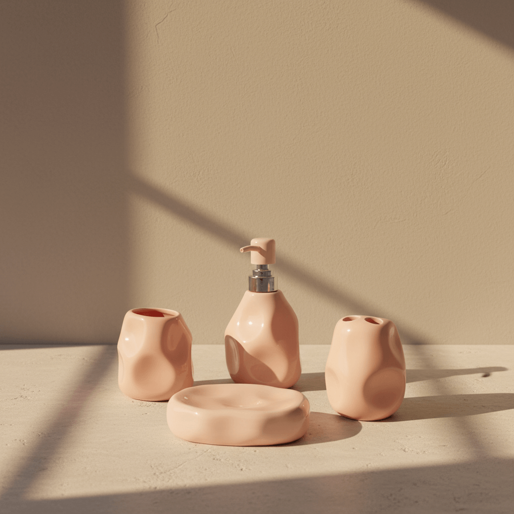 The blush pink bathroom set stands out with its artistic silhouette and pastel allure compared to ordinary, mass-produced designs. Its handcrafted appearance adds boutique charm and elevates any bathroom instantly. Choosing this set means choosing lasting visual joy and assured durability—a combination that adds value to any Lebanese home.