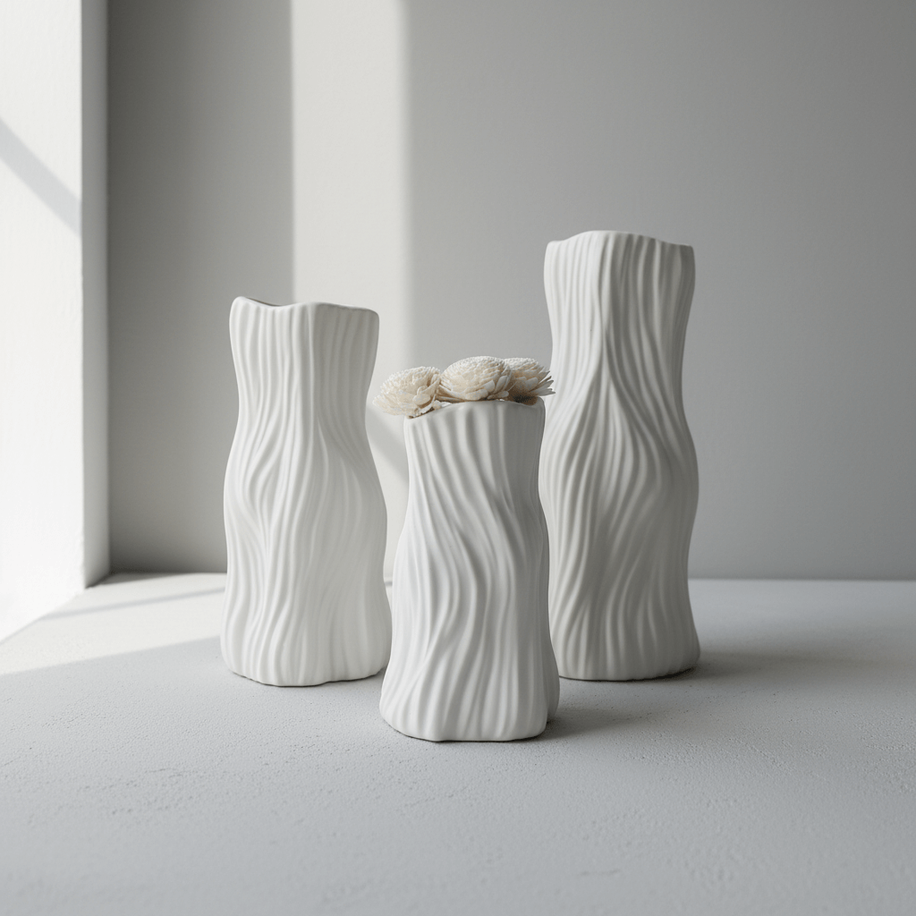 A modern sculpted ceramic vase with soft wavy textures and a matte white finish. Available in three sizes, perfect for styling shelves, tables, and centerpieces.