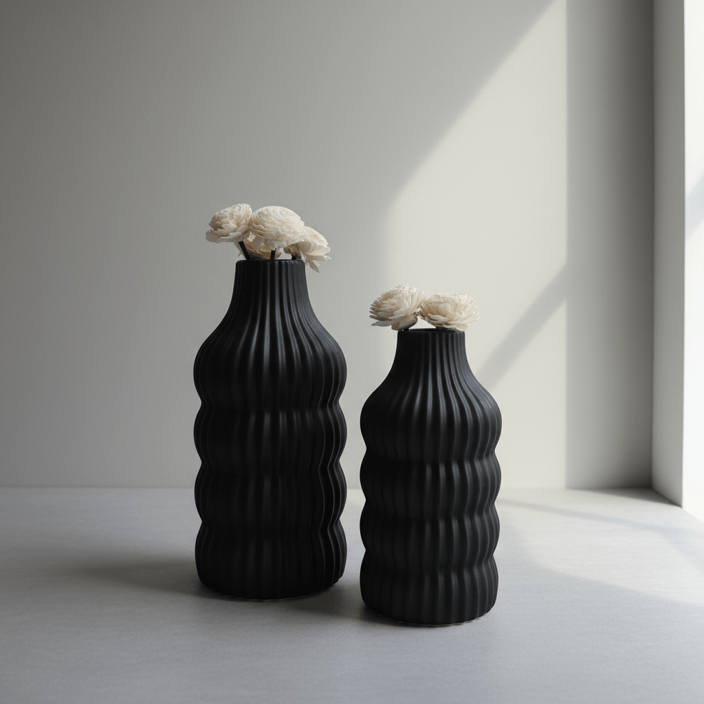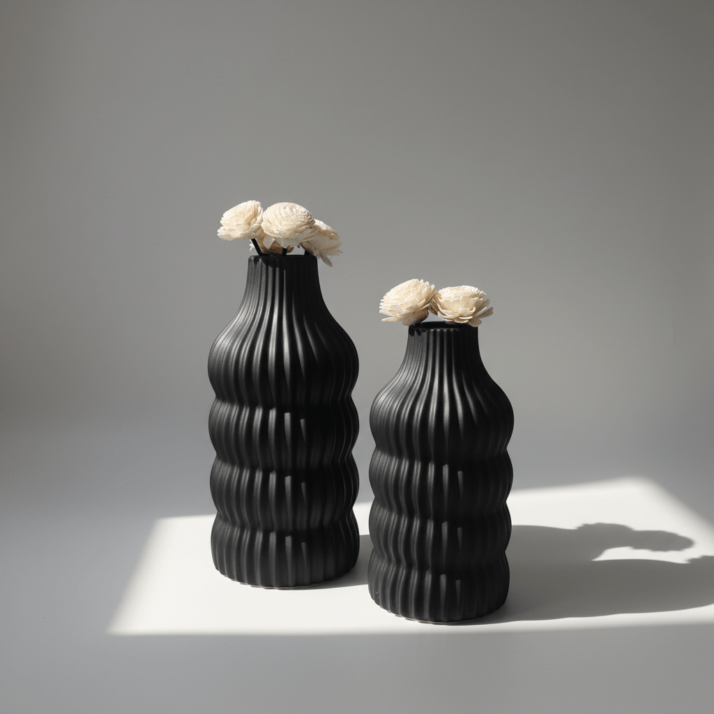 A modern cylinder ceramic vase available in white and black, designed with a sculpted wave texture for a bold decorative look. Choose from two sizes to style flowers, pampas, or standalone arrangements. A perfect accent for living rooms, bedrooms, offices, and minimal home interiors.