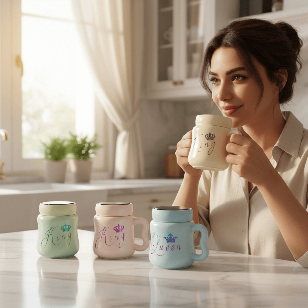 A charming ceramic mug with a glossy pastel finish, matching lid, and elegant “King” or “Queen” script. Ideal for gifts, couples, and everyday use.