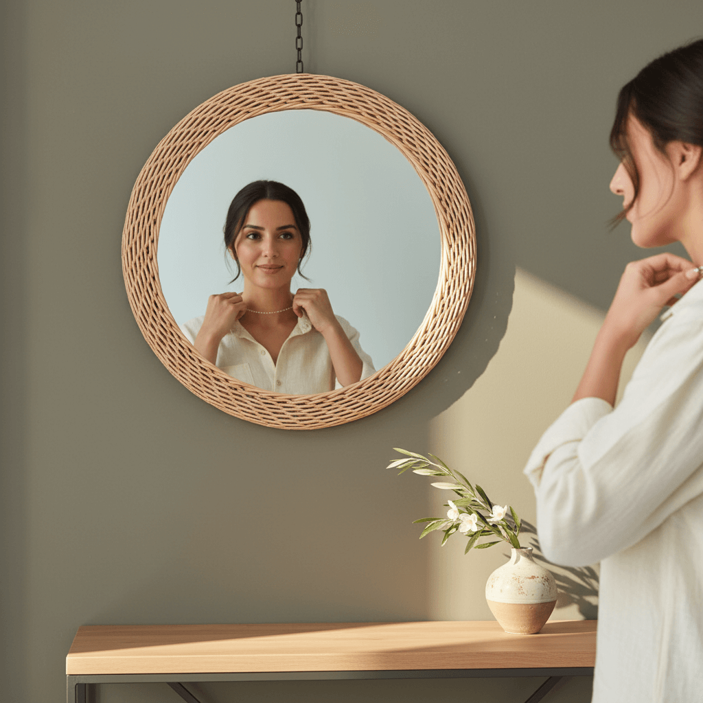 Thoughtfully designed for those seeking to refresh their walls, this straw-framed mirror adds light and a sense of openness while showcasing your taste for distinctive, nature-inspired decor. With its classic beige tone, it blends seamlessly in bedrooms, entryways, living spaces, or even cozy bathrooms for an inviting touch.