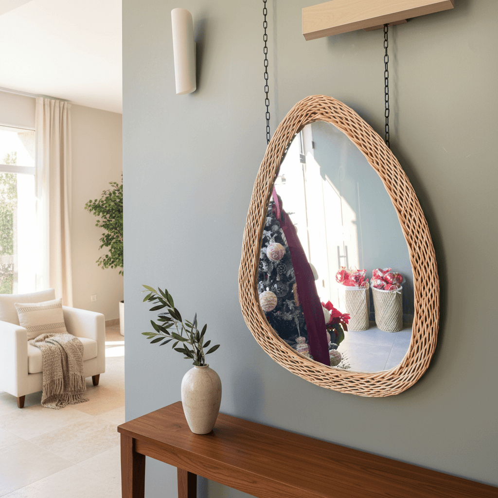 This straw-framed mirror brings natural warmth and style to any room. Features a beautiful beige frame and practical 68*50 cm size, perfect for Lebanese homes.