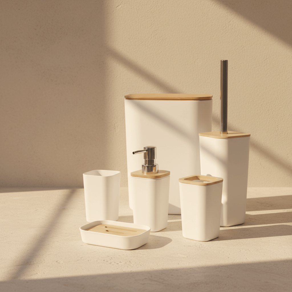 Refresh your bathroom with this 6-piece white bathroom accessory set. Features smooth minimalist lines, natural accent detailing, and perfect organization for Lebanese homes.