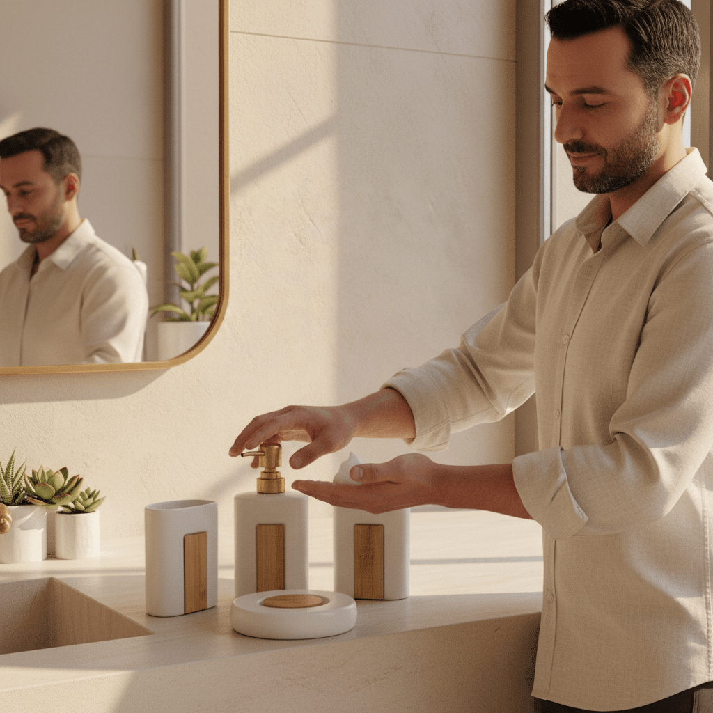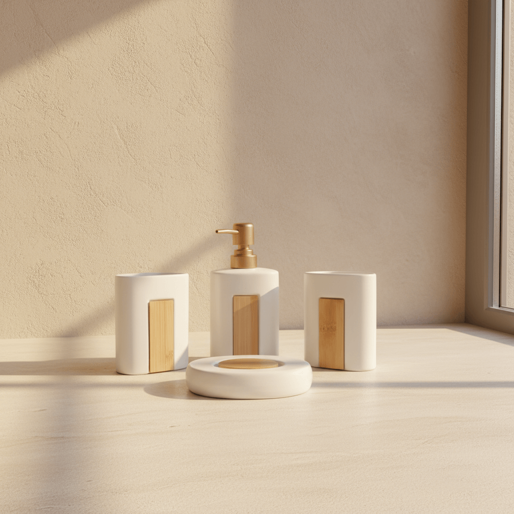 The white ceramic bathroom set combines smooth crafted design and natural bamboo accents for an effortlessly sophisticated upgrade to your vanity. Discover a serene blend of durability and minimalist elegance, curated specifically for modern Lebanese homes seeking tranquility and function in every detail.